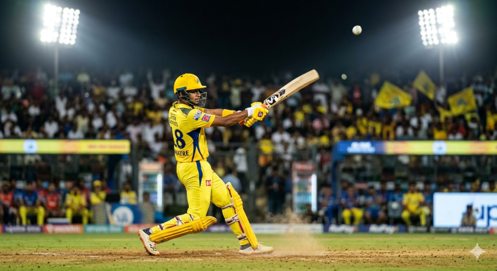 Image Prompt: Hyper-realistic, 8k resolution photo of a young Indian cricketer in a yellow CSK jersey hitting a massive pull shot under stadium floodlights. Intense atmosphere, blurred crowd in the background, dust rising from the pitch, cinematic lighting.